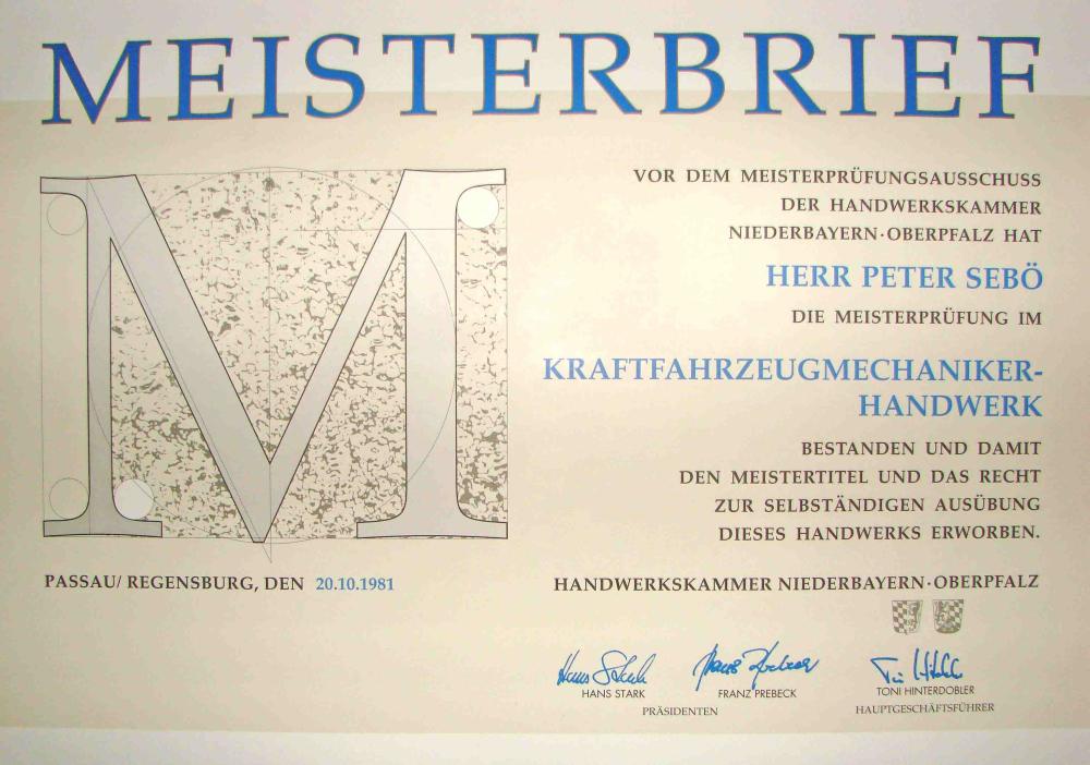 Anders bei BEST CARWASH Regensburg: Unser Chef Peter Sebö hat im Oktober 1981 seine Kraftfahrzeugmeisterprüfung vor der Handwerkskammer Niederbayern/Oberpfalz absolviert. Also vor mehr als 30 Jahren! Der Kfz-Experte lässt seine Erfahrung im täglichen Betrieb unseren Kunden, aber auch allen Mitarbeitern bei deren regelmäßigen Schulungen zu Gute kommen. | |