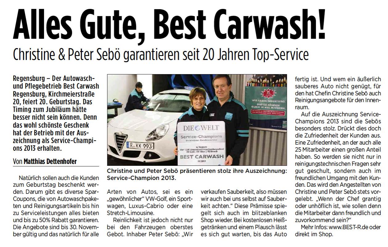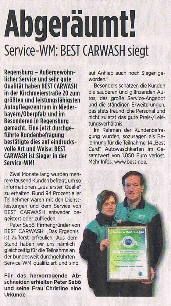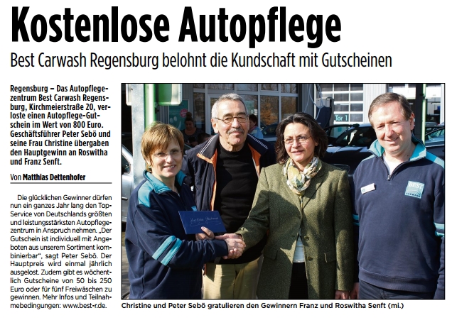Auch das soziale Engagement, für die Sebös eine Herzenssache, kommt bei BEST CARWASH nicht zu kurz. Um die 20 meist regionalen, sozialen Projekte werden unterstützt. Darüber hinaus betreibt die Firma zwei Blockheizkaftwerke zur Reduzierung der CO2-Emission. Das Auto-Pflegezentrum hat sich dem Umweltgedanken verschrieben, denn es werden nur biologisch abbaubare Chemikalien verwendet. Die Familie Sebö ist der Meinung, dass Unternehmen eine gesellschaftliche Verantwortung tragen, weshalb Nachhaltigkeit, Umweltbewusstsein und soziales Engagement von elementarer Bedeutung sind. |