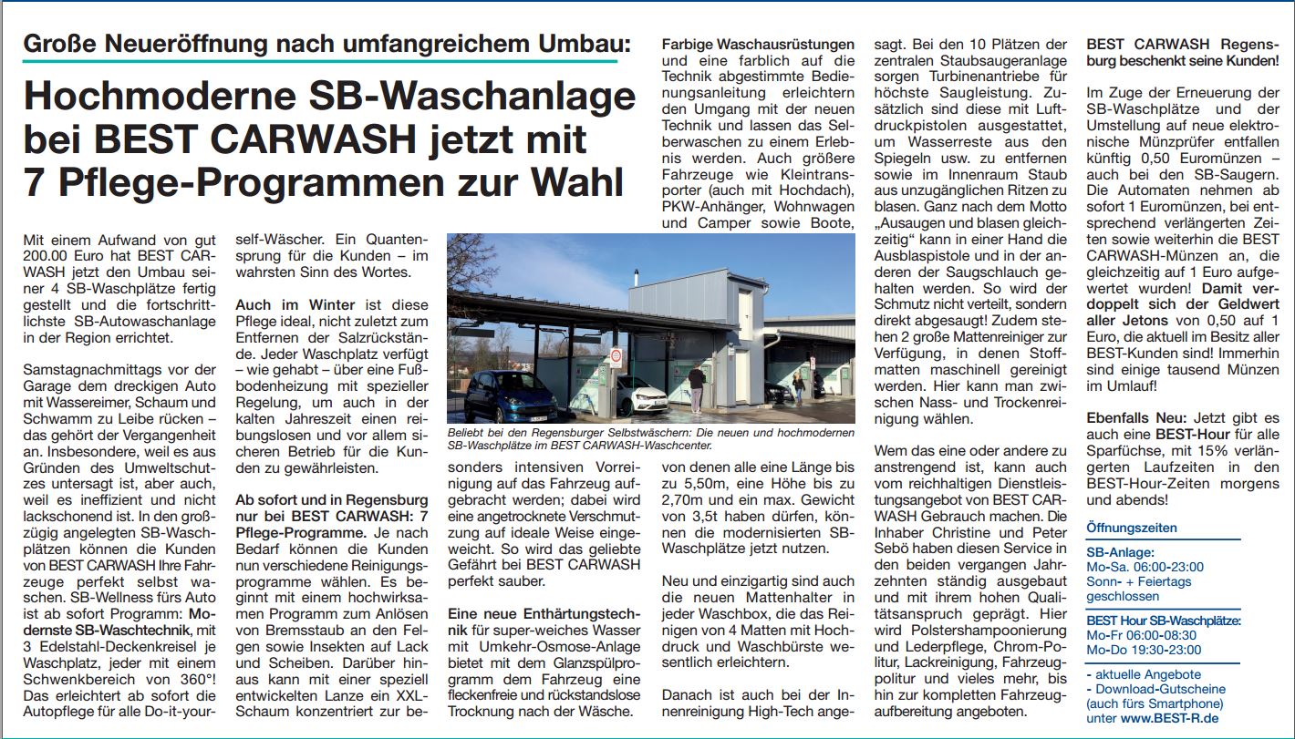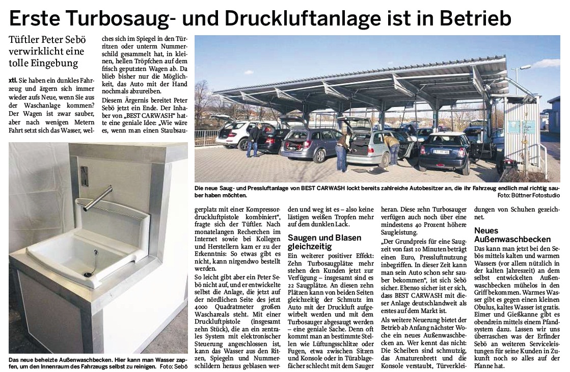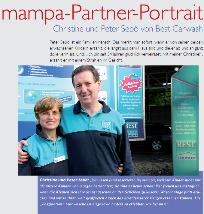 Auch das soziale Engagement, für die Sebös eine Herzenssache, kommt bei BEST CARWASH nicht zu kurz. Um die 20 meist regionalen, sozialen Projekte werden unterstützt. Darüber hinaus betreibt die Firma zwei Blockheizkaftwerke zur Reduzierung der CO2-Emission. Das Auto-Pflegezentrum hat sich dem Umweltgedanken verschrieben, denn es werden nur biologisch abbaubare Chemikalien verwendet. Die Familie Sebö ist der Meinung, dass Unternehmen eine gesellschaftliche Verantwortung tragen, weshalb Nachhaltigkeit, Umweltbewusstsein und soziales Engagement von elementarer Bedeutung sind. |